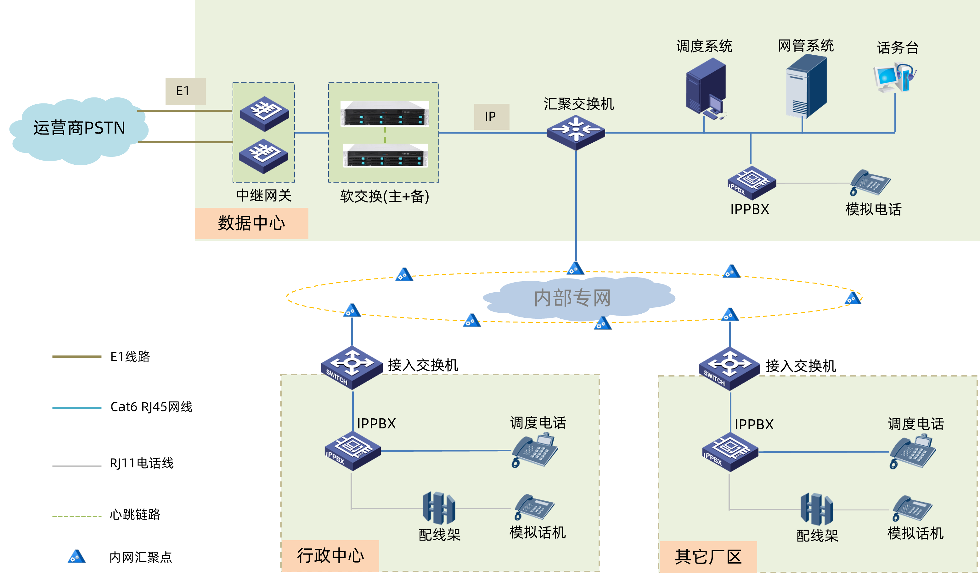 數(shù)據(jù)中心機(jī)房部署1套主備軟交換服務(wù)器(核心設(shè)備)、中繼網(wǎng)關(guān)、調(diào)度系統(tǒng)(含調(diào)度臺)、錄音系統(tǒng)和話務(wù)臺等;行政中心和其它廠區(qū)部署IPPBX和調(diào)度電話。從基本網(wǎng)絡(luò)層級來說,數(shù)據(jù)中心的主備軟交換是固話網(wǎng)絡(luò)的匯聚節(jié)點和承載樞紐,軟交換與IPPBX通過內(nèi)部專網(wǎng)實現(xiàn)互聯(lián)互通。