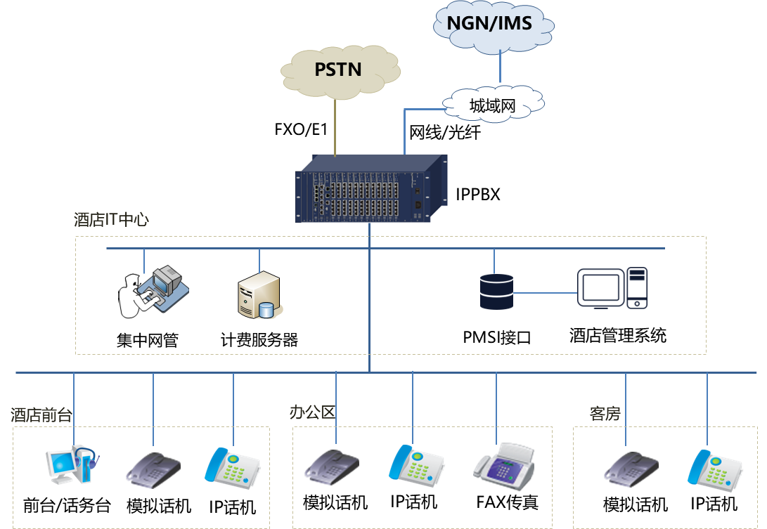 酒店部署標(biāo)準(zhǔn)的IP語(yǔ)音系統(tǒng),具備呼叫引導(dǎo)、留言、叫醒、話務(wù)臺(tái)等基本功能;為酒店辦公行政人員提供傳統(tǒng)模擬電話和IP電話及增值應(yīng)用;為總機(jī)和前臺(tái)提供基于IP的純軟話務(wù)臺(tái)應(yīng)用,與酒店管理系統(tǒng)配合;為酒店客房提供融合通信語(yǔ)音解決方案。