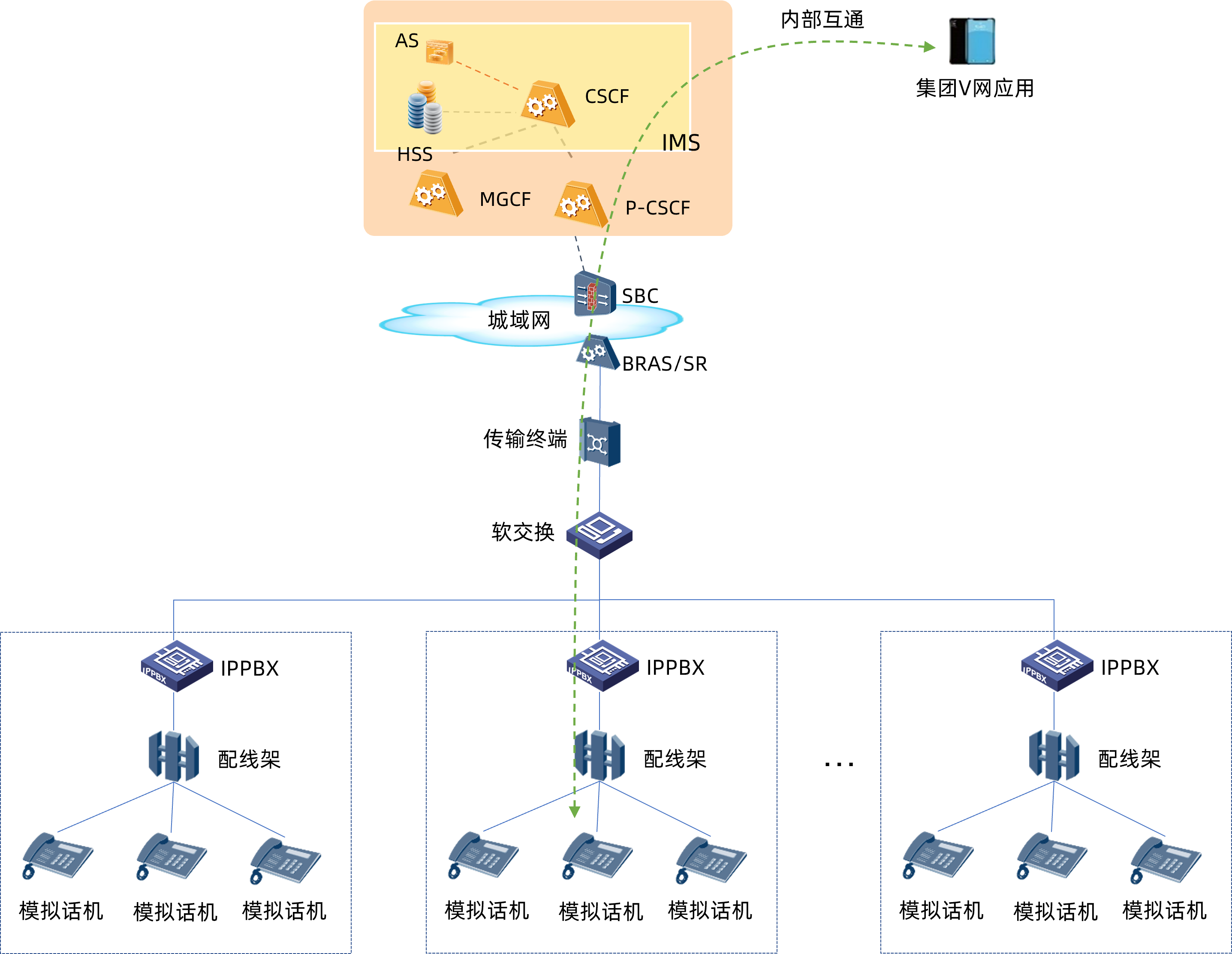 軟交換作為語音通信網絡的匯聚節(jié)點和承載樞紐,通過以太網口上聯傳輸終端接入城域網,注冊至運營商核心側SBC服務器,來承載核心網IMS業(yè)務和端口號碼的下發(fā),實現內外線功能,并實現固話和手機短號互撥的綜合V網業(yè)務。