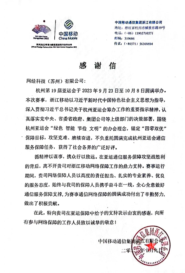在2023杭州亞運(yùn)會(huì)期間,智能連接積極響應(yīng)浙江移動(dòng)安排,以高度的責(zé)任擔(dān)當(dāng)、扎實(shí)的專(zhuān)業(yè)素養(yǎng)、優(yōu)良的服務(wù)態(tài)度,盡最大努力,始終與浙江移動(dòng)攜手奮戰(zhàn)以先,為亞運(yùn)保障工作發(fā)光發(fā)熱,得到了浙江移動(dòng)的高度肯定。