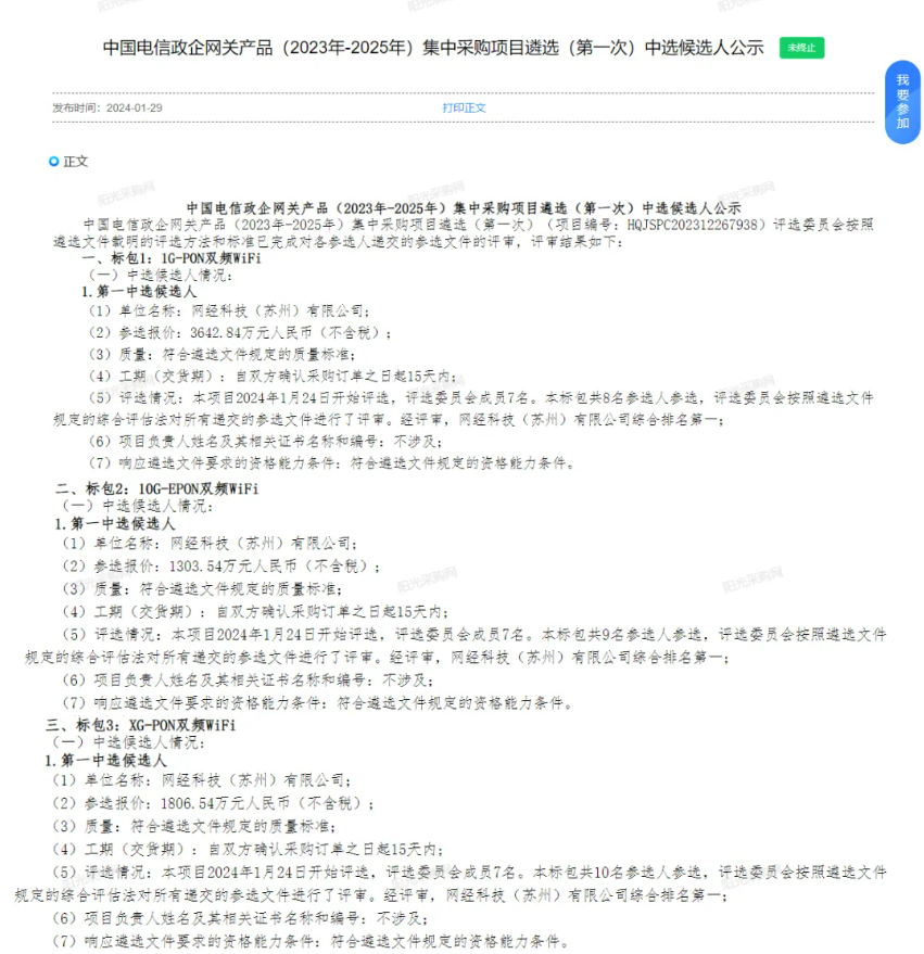 本次項(xiàng)目招標(biāo)為中國(guó)電信政企網(wǎng)關(guān)產(chǎn)品(2023年-2025年)集中采購(gòu)項(xiàng)目遴選(第一次),招標(biāo)標(biāo)包包括包1:1G-PON雙頻WiFi、包2:10G-EPON雙頻WiFi、包3:XG-PON雙頻WiFi,在意向投標(biāo)廠(chǎng)家大廠(chǎng)云集、招標(biāo)技術(shù)點(diǎn)要求嚴(yán)苛的情況下,初靈股份·智能連接·網(wǎng)經(jīng)科技最終以三個(gè)標(biāo)包皆為第一名中標(biāo)的成績(jī)下順利奪得此標(biāo)。
