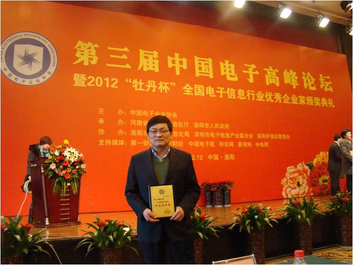 近日,第三屆中國電子高峰論壇暨2012“牡丹杯”全國電子信息行業(yè)優(yōu)秀企業(yè)家頒獎(jiǎng)典禮在河南洛陽鉬都利豪國際飯店隆重舉行,國家相關(guān)部委領(lǐng)導(dǎo),中國電子企業(yè)協(xié)會(huì)副會(huì)長、常務(wù)理事、理事、會(huì)員濟(jì)濟(jì)一堂,為2012年在電子信息產(chǎn)業(yè)界做出突出貢獻(xiàn)及成績的優(yōu)秀企業(yè)家進(jìn)行頒獎(jiǎng)。網(wǎng)經(jīng)科技(蘇州)有限公司總裁劉繼明博士受邀參加并一舉榮獲“2012年全國電子信息行業(yè)杰出企業(yè)家”稱號(hào)。