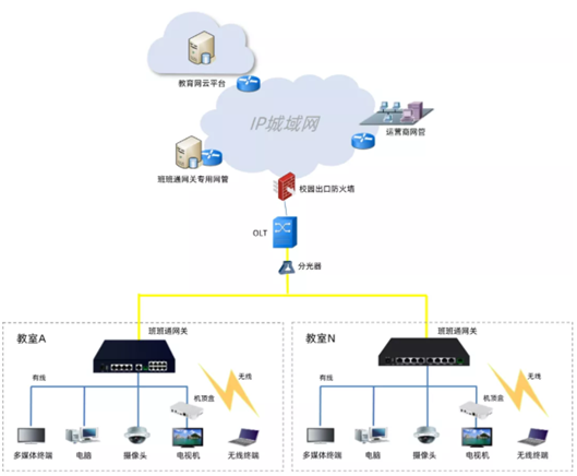 “班班通”教室網(wǎng)絡(luò)組網(wǎng)全部采用光纖接入方式,核心路由設(shè)備連接各個(gè)區(qū)域匯聚設(shè)備,匯聚設(shè)備到校采用直連光纖,到校后進(jìn)行分光接入教室,教室網(wǎng)關(guān)統(tǒng)一下掛教學(xué)終端。