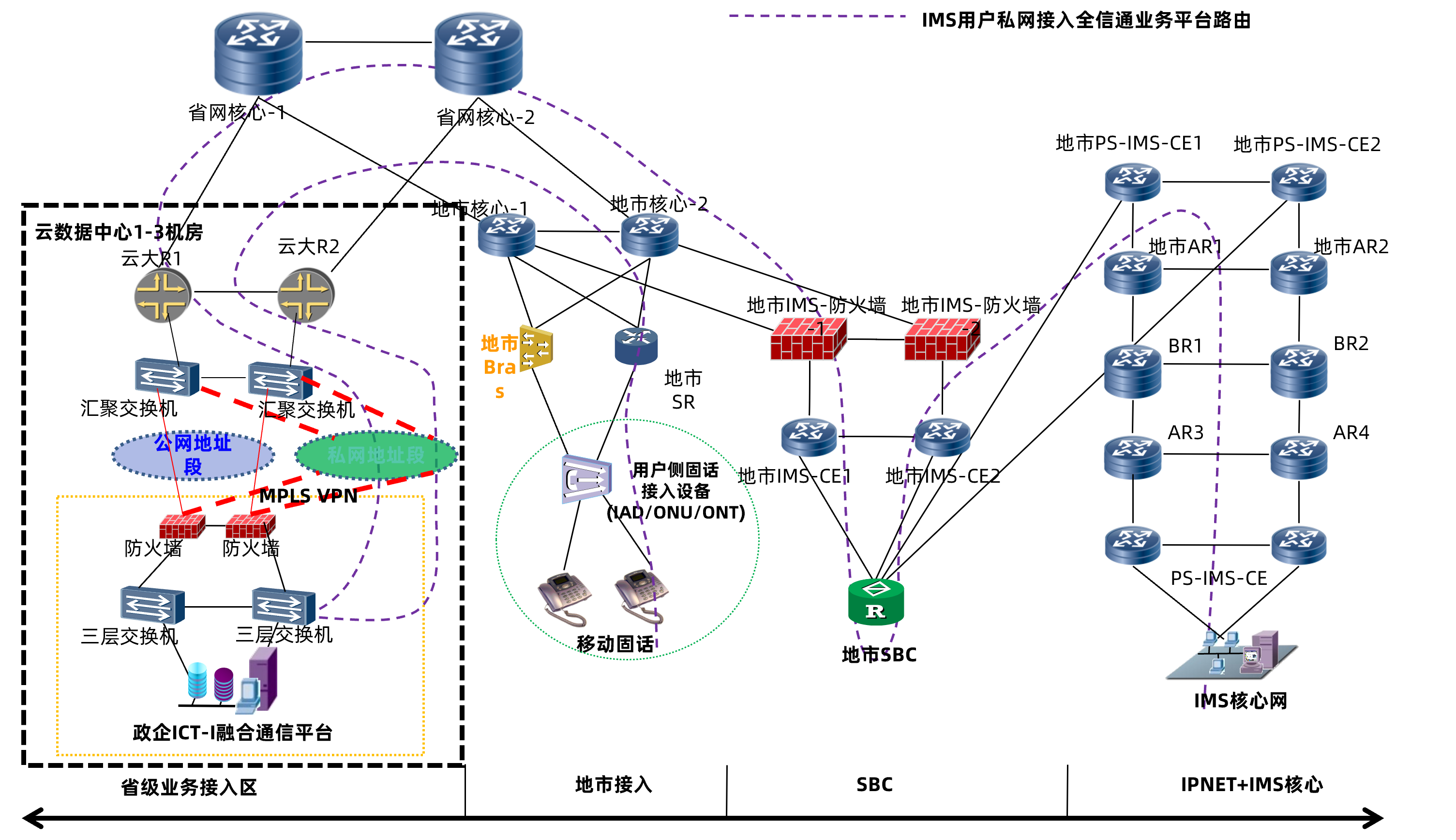 云PBX平臺部署在運營商省級/地市數(shù)據(jù)中心機房或樞紐機房,采用本地服務(wù)器或虛擬機,公網(wǎng)、內(nèi)網(wǎng)通道獨立,內(nèi)網(wǎng)通過MPLS VPN接入。平臺分配內(nèi)網(wǎng)地址和公網(wǎng)地址,內(nèi)網(wǎng)地址配置在平臺網(wǎng)絡(luò)接口上,公網(wǎng)地址通過端口映射方式。